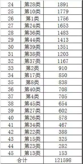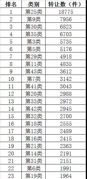 商标大数据,我们对2017年上半年的商标转让量按类别进行分析统计,分析统计结果如下:转让对于发挥商标的价值具有积极的作用,也同时反映了投资商标的人的回报。对于商标投资是一个极好的数据参考。