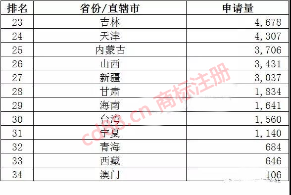 2018年1月份商标注册大数据—全国每个省份注册申请量统计