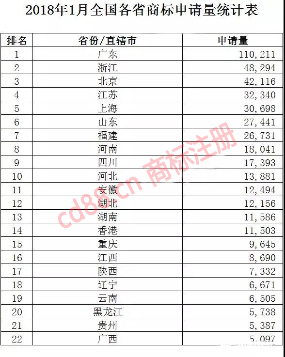 初步统计,2018年1月全国申请量达586987件,比上年同期增加305716件,增长108.69%,日均申请量达到26681件。从全国各省份商标申请量看,申请量最大的前5个省份依次为广东(110211件)、浙江(48294件)、北京(42116件)、江苏(32340件)、上海(30698件)。