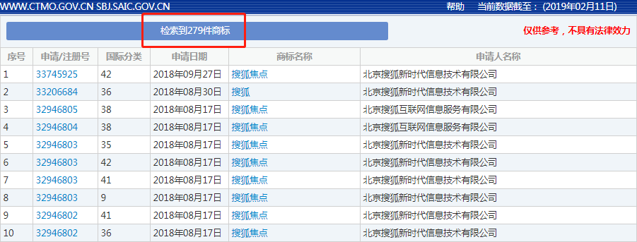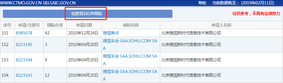 从中国商标网查询可知,有关“搜狐”的商标共计有279件,其中包括搜狐集团的181件,也就是说有98件并非搜狐集团注册的。