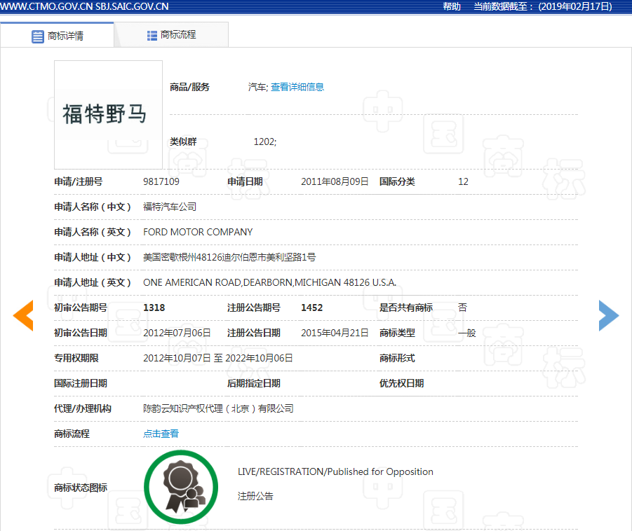 根据商标局数据显示,2011年08月09日,福特公司申请注册了第9817109号“福特野马”商标(即诉争商标),核定使用在第12类产品上,并于2015年04月21日核准注册。
