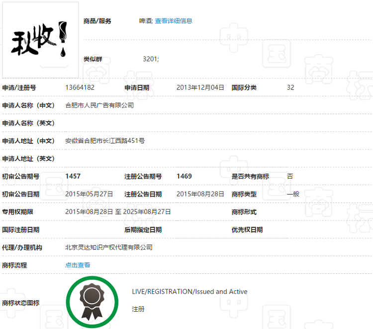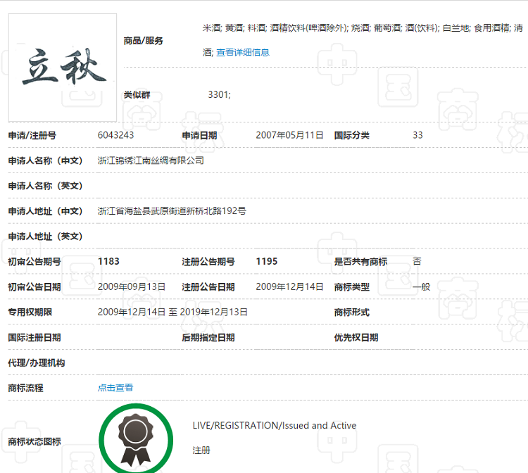 有意思的是,早在2007年,就已经有一家公司以“立秋”为商标进行了注册。