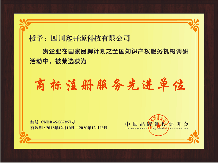 热烈祝贺:四川鑫开源科技有限公司荣获《商标注册服务先进单位》称号。自国家品牌战略提出之后,各级政府和行业积极响应,制定了相关的品牌发展战略,在打造中国品牌的进程中,取得了积极的成果,对于各个层面的机构的工作也有了更高更新的要求。在中国品牌建设促进会对全国知识产权建设的各个组成层级的调研活动中国,四川鑫开源科技有限公司作为国家商标局授权代理,作为四川知名的商标注册服务机构,很荣幸的获得了《商标注册服务先进单位》的称号。