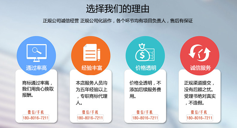 专业高效:一对一商标顾问专业服务!省去您的车马劳顿,更加省去您资料不合格的往返耗时;为抢占商标节约时间。